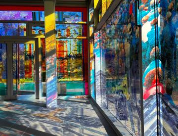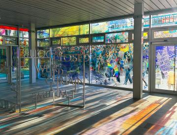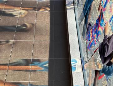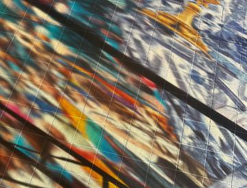 In Potsdam hat Sabine Hornig die gesamte Glasfassade des 1973 errichteten, spätmodernen Glaspavillons bearbeitet. Ihre Installation verwandelt die Pavillonscheiben in einen weitläufigen Bilderbogen, auf dem Demonstrationsszenen, Fassaden des Typenwohnungsbaus aus der Entstehungszeit des Gebäudes und Funktionsarchitekturen der deutschen Demokratiegeschichte miteinander verschmelzen. Ausschnitte des barocken und klassizistischen Potsdam stehen dazu in scharfem Kontrast.