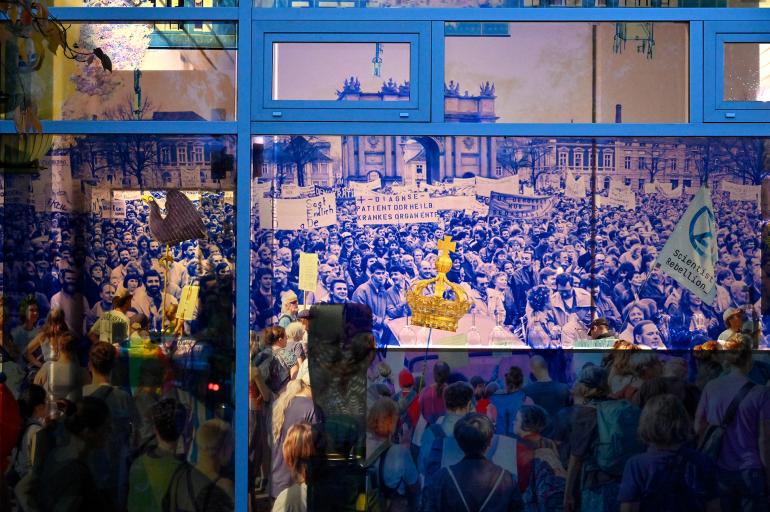 In Sabine Hornigs „Zwischenraum des utopischen Gedächtnisses“ mischen sich Abrissszenen aus der Rückabwicklung der modernen Stadt mit historischen Momenten, in denen öffentliche Gebäude zur stummen Bühne für demokratische Aufbrüche wurden. Die Identität unserer Stadt wird selbst als zusammengesetztes künstliches Gebilde erkennbar – in dem wir täglich neu darüber entscheiden, wie wir einander begegnen wollen und ob wir uns an die Gleichheitsversprechen der Moderne noch erinnern wollen.