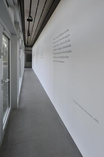 Der Pavillon auf der Freundschaftsinsel, abgedunkelt und abgeschottet, wird für diese Ausstellung zum Kinosaal. Er wird aber auch zu einer geschlossenen Box, in der uns das Fremde begegnet. Die Außenseiter stehen vor uns und wir bemerken, dass Kunst seit Jahrhunderten von ihrem Mut zur Abweichung und ihrer Sympathie mit den Außenseitern lebt. Die Abweichung kann nicht entweichen aus Pouthiers verhängter Kammer. Wir können uns ihr aber nähern und mit Hilfe des durchaus unterhaltsamen Medium Film unsere Regeln justieren.