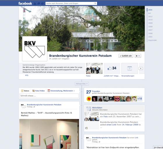Seit ein paar Tagen ist der BKV zusätzlich auch auf Facebook mit allen Projekten seit 2005 vertreten. www.facebook.com/BKVPotsdam ist gegenwärtig noch ein bebildertes Archiv mit Ausstellungslinks, wird künftig aber auch vermehrt über die Arbeit hinter den Kulissen berichten.