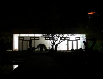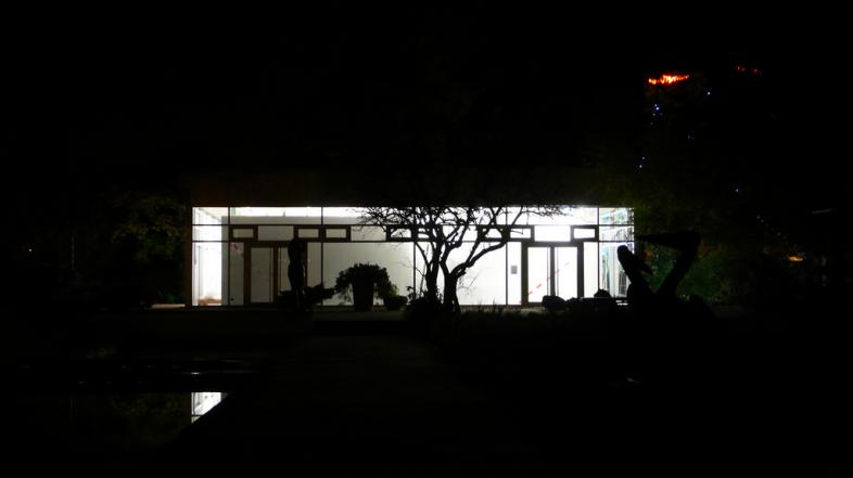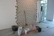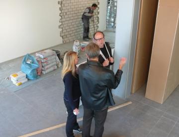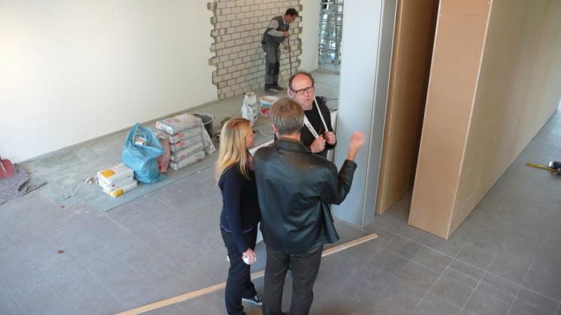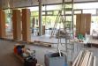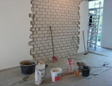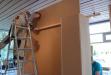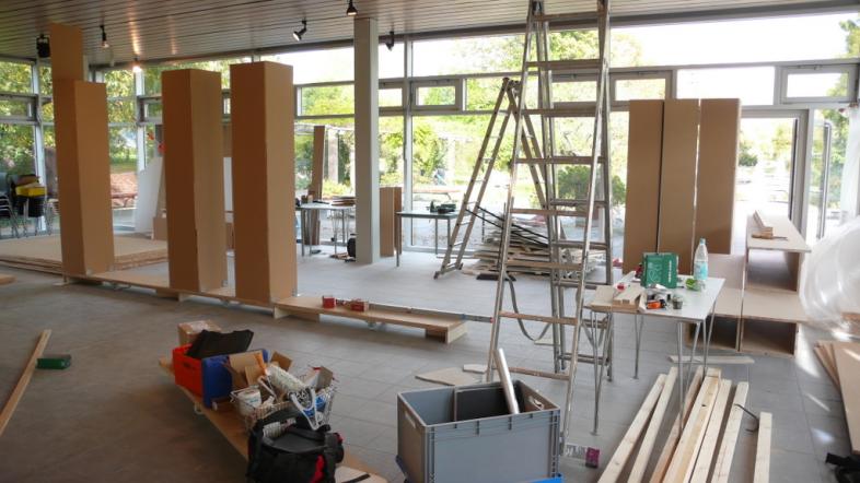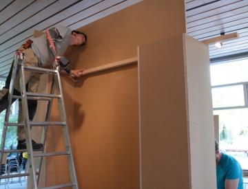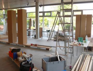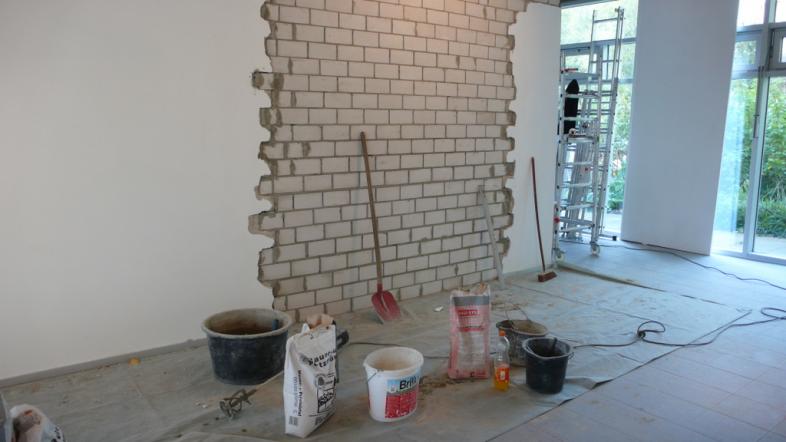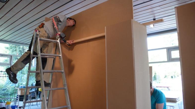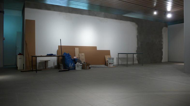 Das neue mobile System aus Leichtbauplatten wurde von Serge de Waha aus Stuttgart entwickelt, vor Ort zugeschnitten, getestet und installiert. Die vier Einheiten zu je zweimal 5,50 m und 5 m fahren auf Rollen und sind im Handumdrehen zu bewegen. Zur gleichen Zeit wurde die fest eingebaute Wand auf eine Höhe von 3 m erhöht und begradigt. Das ergibt eine ideale und flexible Hängfläche im Pavillon.