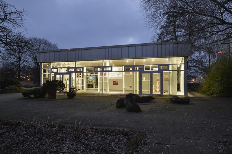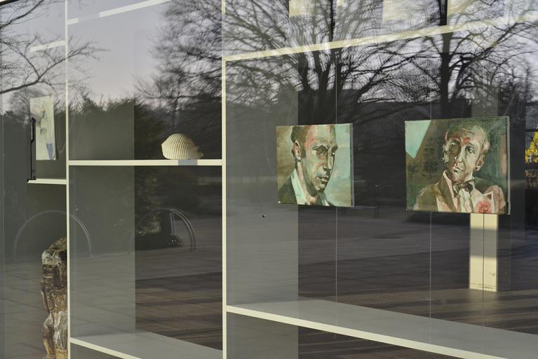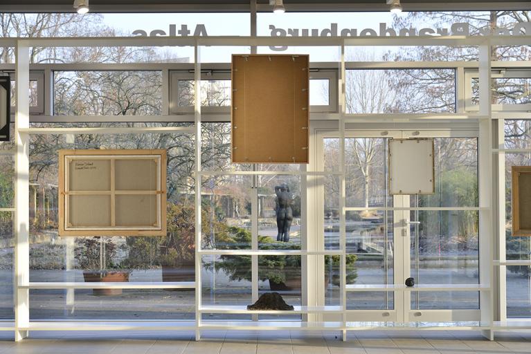 Zu den Führungsterminen aber öffnen wir den Raum. Dabei ergibt sich nicht nur die Gelegenheit zum Gespräch, sondern auch die Chance, einen Blick hinter die Kulissen der Ausstellungshängung zu werfen. Die Rückseiten der Gemälde und Objekte ergeben ein Spiegelbild der Außenansicht.