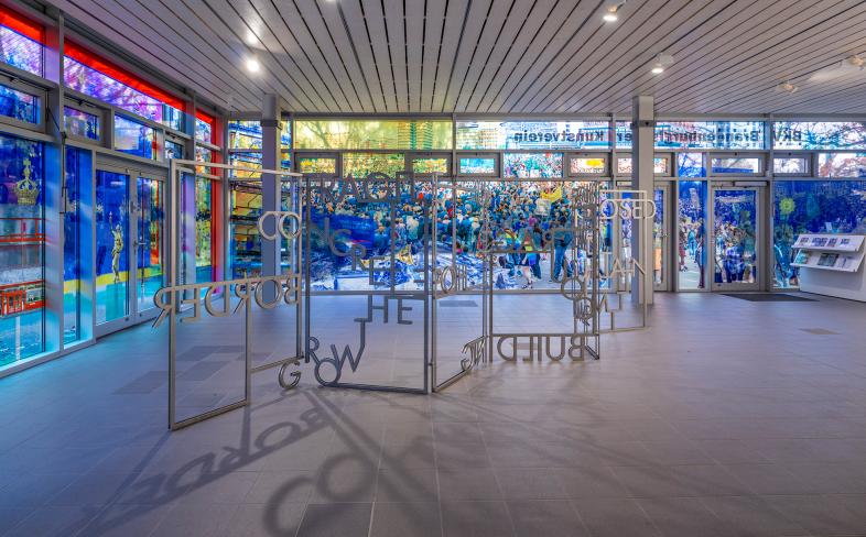 Hornig setzt damit eine vielbeachtete Werkserie im öffentlichen Raum fort, in der sie sich mit dem Selbstverständnis offener Gesellschaften auseinandersetzt, wie etwa 2020 in einer fast 13 Meter hohen Installation auf der Glasfassade des New Yorker La Guardia Airports. Dort verschmolzen die Geometrien der Metropole mit Textfragmenten zu einem Mikrokosmos der Kulturen. Auch eine gerade entstehende Arbeit an einem Neubau des Deutschen Bundestages befasst sich mit dem Spannungsverhältnis von Demokratie- und Baugeschichte.