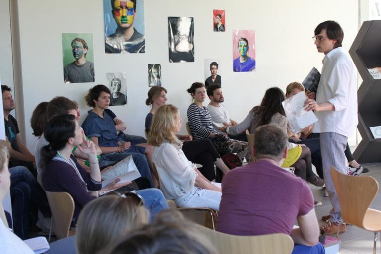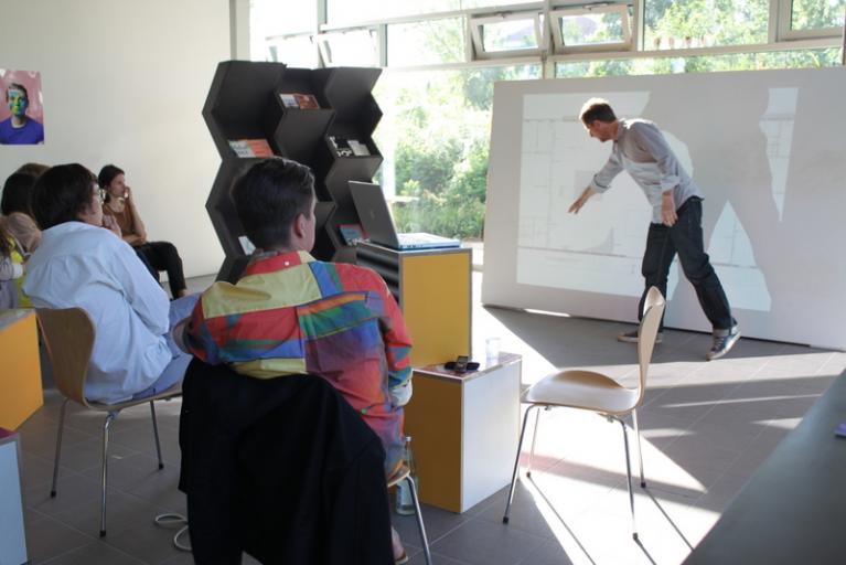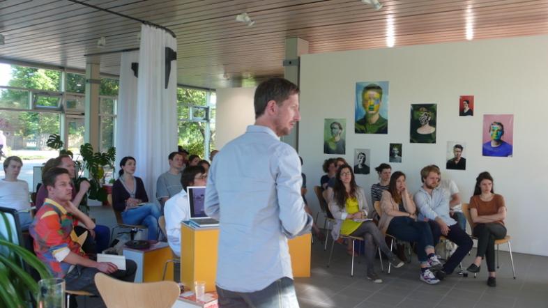 Dabei werden beide Gäste, moderiert von Oliver Klimpel, aus ihrer aktuellen Praxis berichten. Tilo Schulz, ein Grenzgänger zwischen künstlerischer und kuratorischer Praxis mit unkonventionellem Werdegang, präsentiert dem Publikum seine architektonischen Interventionen in der Wiener Secession und der Temporären Kunsthalle Berlin. In ihnen setzt eine künstlerische Ausstellungsarchitektur dem Publikum Grenzen, um es so zur Auseinandersetzung mit dem einzelnen Werk einzuladen. Die Zurichtung des Raums soll Freiheit schaffen, für die in betriebswirtschaftlich optimierten Ausstellungssituationen oft kein Platz mehr ist. Manuel Raeder hingegen, unterwirft seine Designpraxis so weit wie möglich den künstlerischen Anforderungen und schöpft aus Chaos, gegebenen Faktoren und schneeballartiger Kommunikation die Impulse für eine materialorientierte Buch- und Grafikproduktion.